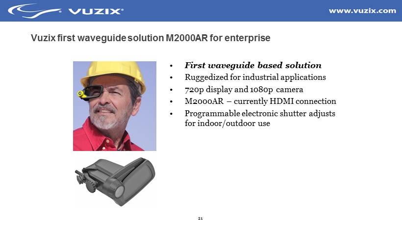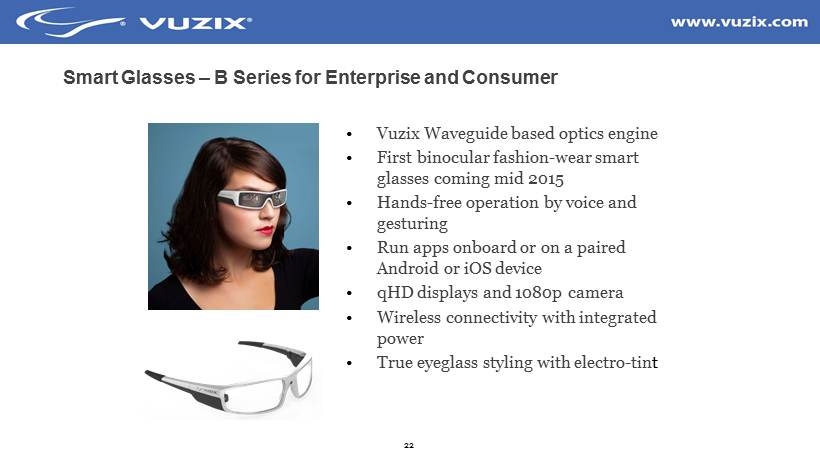 21 Vuzix first waveguide solution M2000AR for enterprise • First waveguide based solution • Ruggedized for industrial applications • 720p display and 1080p camera • M2000AR – currently HDMI connection • Programmable electronic shutter adjusts for indoor/outdoor use