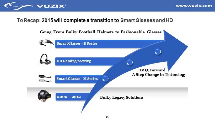 23 Smart Glasses – B Series HD Gaming/Viewing Smart Glasses – M Series 2000 – 2012 To Recap: 2015 will complete a transition to Smart Glasses and HD Bulky Legacy Solutions 2015 Forward A Step Change in Technology Going From Bulky Football Helmets to Fashionable Glasses