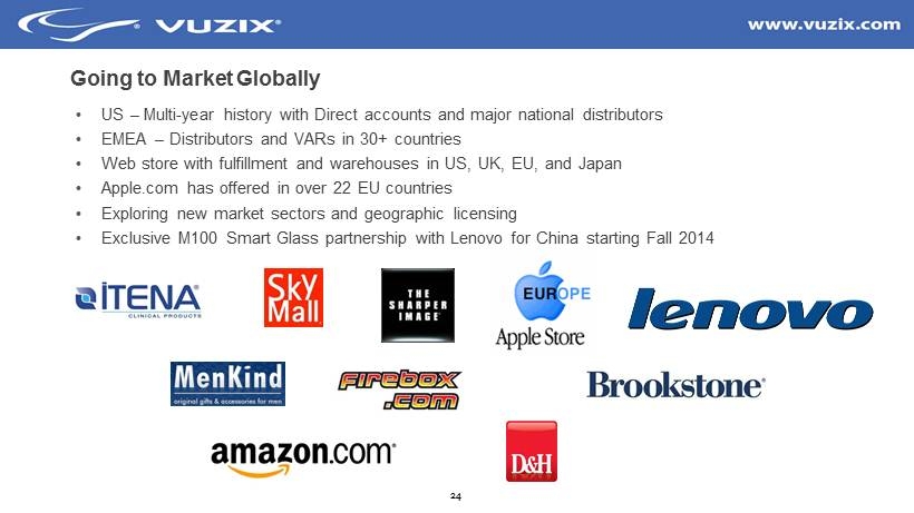 24 Going to Market Globally • US – Multi - year history with Direct accounts and major national distributors • EMEA – Distributors and VARs in 30+ countries • Web store with fulfillment and warehouses in US, UK, EU, and Japan • Apple.com has offered in over 22 EU countries • Exploring new market sectors and geographic licensing • Exclusive M100 Smart Glass partnership with Lenovo for China starting Fall 2014