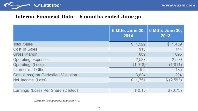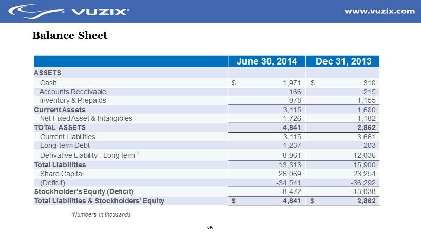 25 Interim Financial Data – 6 months ended June 30 *Numbers in thousands excluding EPS 6 Mths June 30, 2014 6 Mths June 30, 2013 Total Sales $ 1,522 $ 1,439 Cost of Sales 913 744 Gross Margin 609 695 Operating Expenses 2,527 2,509 Operating (Loss) (1,918) (1,814) Interest and Other - 155 - 485 Gain (Loss) on Derivative Valuation 3,824 - 294 Net Income (Loss) $ 1,751 $ (2,593) Earnings (Loss) Per Share (Diluted) $ 0.15 $ (0.73)