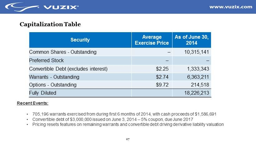 26 Balance Sheet *Numbers in thousands June 30, 2014 Dec 31, 2013 ASSETS Cash $ 1,971 $ 310 Accounts Receivable 166 215 Inventory & Prepaids 978 1,155 Current Assets 3,115 1,680 Net Fixed Asset & Intangibles 1,726 1,182 TOTAL ASSETS 4,841 2,862 Current Liabilities 3,115 3,661 Long - term Debt 1,237 203 Derivative Liability - Long term 1 8,961 12,036 Total Liabilities 13,313 15,900 Share Capital 26,069 23,254 (Deficit) - 34,541 - 36,292 Stockholder’s Equity (Deficit) - 8,472 - 13,038 Total Liabilities & Stockholders’ Equity $ 4,841 $ 2,862