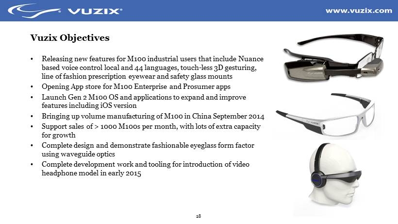28 Vuzix Objectives • Releasing new features for M100 industrial users that include Nuance based voice control local and 44 languages, touch - less 3D gesturing, line of fashion prescription eyewear and safety glass mounts • Opening App store for M100 Enterprise and Prosumer apps • Launch Gen 2 M100 OS and applications to expand and improve features including iOS version • Bringing up volume manufacturing of M100 in China September 2014 • Support sales of > 1000 M100s per month, with lots of extra capacity for growth • Complete design and demonstrate fashionable eyeglass form factor using waveguide optics • Complete development work and tooling for introduction of video headphone model in early 2015