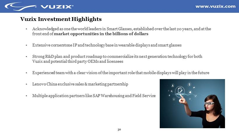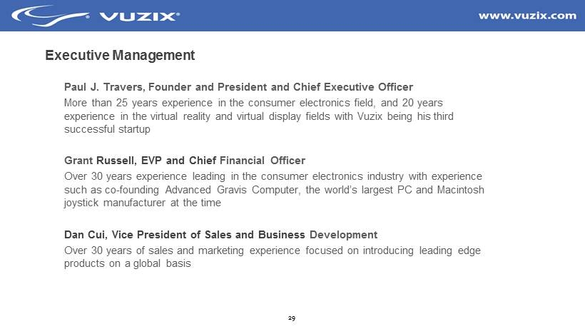 29 Executive Management Paul J. Travers, Founder and President and Chief Executive Officer More than 25 years experience in the consumer electronics field, and 20 years experience in the virtual reality and virtual display fields with Vuzix being his third successful startup Grant Russell, EVP and Chief Financial Officer O ver 30 years experience leading in the consumer electronics industry with experience such as co - founding Advanced Gravis Computer, the world’s largest PC and Macintosh joystick manufacturer at the time Dan Cui, Vice President of Sales and Business Development O ver 30 years of sales and marketing experience focused on introducing leading edge products on a global basis
