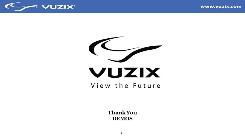 30 Vuzix Investment Highlights • Acknowledged as one the world leaders in Smart Glasses, established over the last 20 years, and at the front end of market opportunities in the billions of dollars • Extensive cornerstone IP and technology base in wearable displays and smart glasses • Strong R&D plan and product roadmap to commercialize its next generation technology for both Vuzix and potential third party OEMs and licensees • Experienced team with a clear vision of the important role that mobile displays will play in the future • Lenovo China exclusive sales & marketing partnership • Multiple application partners like SAP Warehousing and Field Service