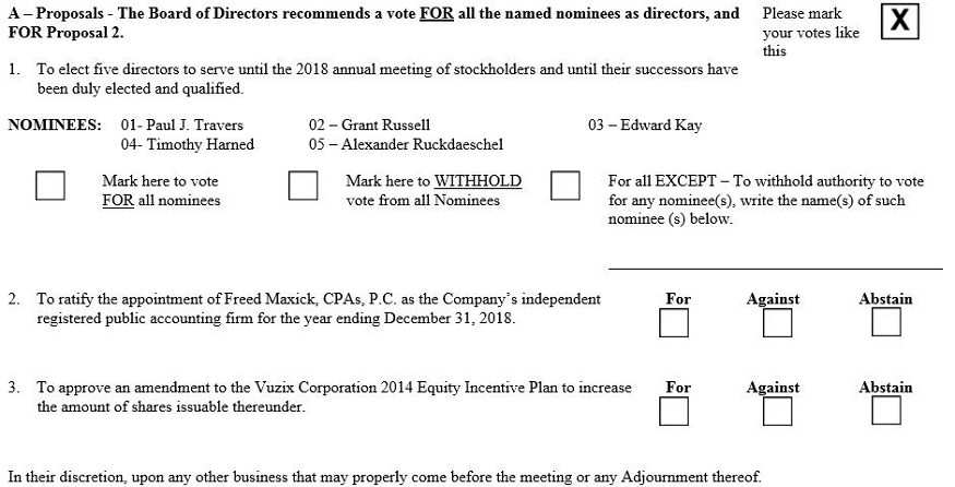 You may either vote “FOR” or “WITHHOLD” authority to vote for each nominee for the board of directors. You may vote “FOR”, “AGAINST” or “ABSTAIN” on the proposal to ratify the selection of Freed Maxick CPAs, P.C. as the independent registered public accounting firm of the Company for the year ending December 31, 2018. You may vote “FOR”, “AGAINST” or “ABSTAIN” on the proposal to approve the amendment to the Vuzix Corporation 2014 Equity Incentive Plan.