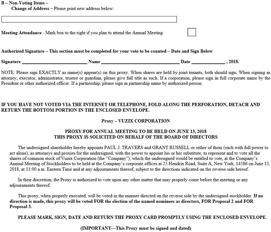 B – Non-Voting Items – Change of Address – Please print new address below: Meeting Attendance - Mark box to the right if you plan to attend the Annual Meeting Authorized Signature – This section must be completed for your vote to be counted – Date and Sign Below Signature Name Date , 2018. NOTE: Please sign EXACTLY as name(s) appear(s) on this proxy. When shares are held by joint tenants, both should sign. When signing as attorney, executor, administrator, trustee or guardian, please give full title as such. If a corporation, please sign in full corporate name by the President or other authorized officer. If a partnership, please sign in partnership name by authorized person. IF YOU HAVE NOT VOTED VIA THE INTERNET OR TELEPHONE, FOLD ALONG THE PERFORATION, DETACH AND RETURN THE BOTTOM PORTION IN THE ENCLOSED ENVELOPE. Proxy – VUZIX CORPORATION PROXY FOR ANNUAL MEETING TO BE HELD ON JUNE 13, 2017 THIS PROXY IS SOLICITED ON BEHALF OF THE BOARD OF DIRECTORS The undersigned shareholder hereby appoints PAUL J. TRAVERS and GRANT RUSSELL or either of them (each with full power to act alone), as attorneys and proxies for the undersigned, with the power to appoint his or her substitute, to represent and to vote all the shares of common stock of Vuzix Corporation (the “Company”), which the undersigned would be entitled to vote, at the Company’s Annual Meeting of Stockholders to be held at the Company’s corporate offices at 25 Hendrix Road, Suite A, New York, 14586 on June 13, 2018, at 11:00 a.m. Eastern Time and at any adjournments thereof, subject to the directions indicated on the reverse side hereof. In their discretion, the Proxy is authorized to vote upon any other matter that may properly come before the meeting or any adjournments thereof. This proxy, when properly executed, will be voted in the manner directed on the reverse side by the undersigned stockholder. If no direction is made, this proxy will be voted FOR the election of the named nominees as directors, FOR Proposal 2 and FOR Proposal 3. PLEASE MARK, SIGN, DATE AND RETURN THE PROXY CARD PROMPTLY USING THE ENCLOSED ENVELOPE. (IMPORTANT—This Proxy must be signed and dated)