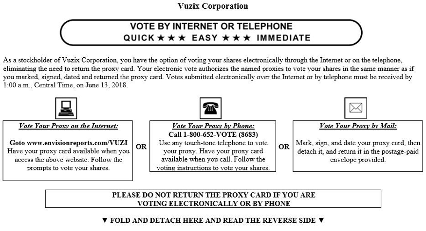 Vuzix Corporation As a stockholder of Vuzix Corporation, you have the option of voting your shares electronically through the Internet or on the telephone, eliminating the need to return the proxy card. Your electronic vote authorizes the named proxies to vote your shares in the same manner as you marked, signed, dated and returned the proxy card. Votes submitted electronically over the Internet or by telephone must be received by 1:00 a.m., Central Time, on June 13, 2018. Vote Your Proxy on the Internet: Goto www.envisionreports.com/VUZI Have your proxy card available when you access the above website. Follow the prompts to vote your shares. OR Vote Your Proxy by Phone: Call 1-800-652-VOTE (8683) Use any touch-tone telephone to vote your proxy. Have your proxy card available when you call. Follow the voting instructions to vote your shares. OR Vote Your Proxy by Mail: Mark, sign, and date your proxy card, then detach it, and return it in the postage-paid envelope provided. PLEASE DO NOT RETURN THE PROXY CARD IF YOU ARE VOTING ELECTRONICALLY OR BY PHONE ¥ FOLD AND DETACH HERE AND READ THE REVERSE SIDE ¥ A . Proposals - The Board of Directors recommends a vote FOR all the named nominees as directors, and FOR Proposal 2. 1. To elect five directors to serve until the 2018 annual meeting of stockholders and until their successors have been duly elected and qualified. Please mark your votes like this NOMINEES: 01- Paul J. Travers 02 . Grant Russell 03 . Edward Kay 04- Timothy Harned 05 . Alexander Ruckdaeschel Mark here to vote FOR all nominees Mark here to WITHHOLD vote from all Nominees For all EXCEPT . To withhold authority to vote for any nominee(s), write the name(s) of such nominee (s) below. 2. To ratify the appointment of Freed Maxick, CPAs, P.C. as the Companyfs independent registered public accounting firm for the year ending December 31, 2018. For Against Abstain 3. To approve an amendment to the Vuzix Corporation 2014 Equity Incentive Plan to increase the amount of shares issuable thereunder. For Against Abstain In their discretion, upon any other business that may properly come before the meeting or any Adjournment thereof.