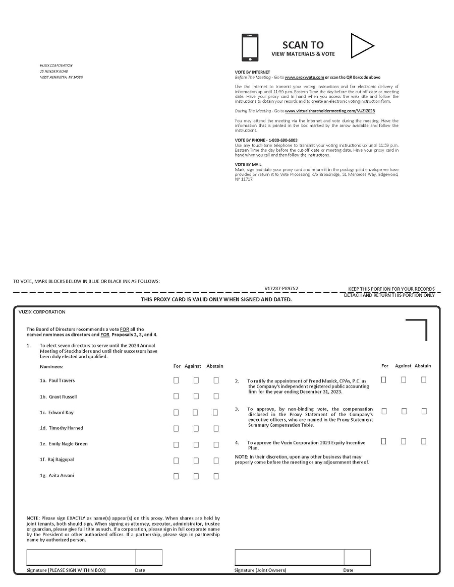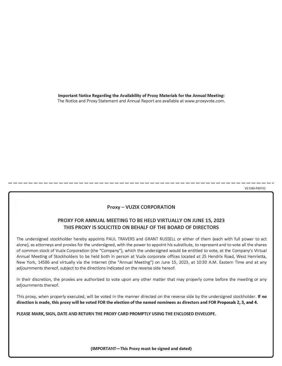 You are cordially invited to attend the Annual Meeting (the “Annual Meeting” or the “Meeting”) of stockholders of Vuzix Corporation. The Meeting will be held on June 15, 2023, at 10:30 a.m. (eastern time) both at Vuzix corporate offices located at 25 Hendrix Road, West Henrietta, New York, 14586 and as a virtual online meeting, for the following purposes: