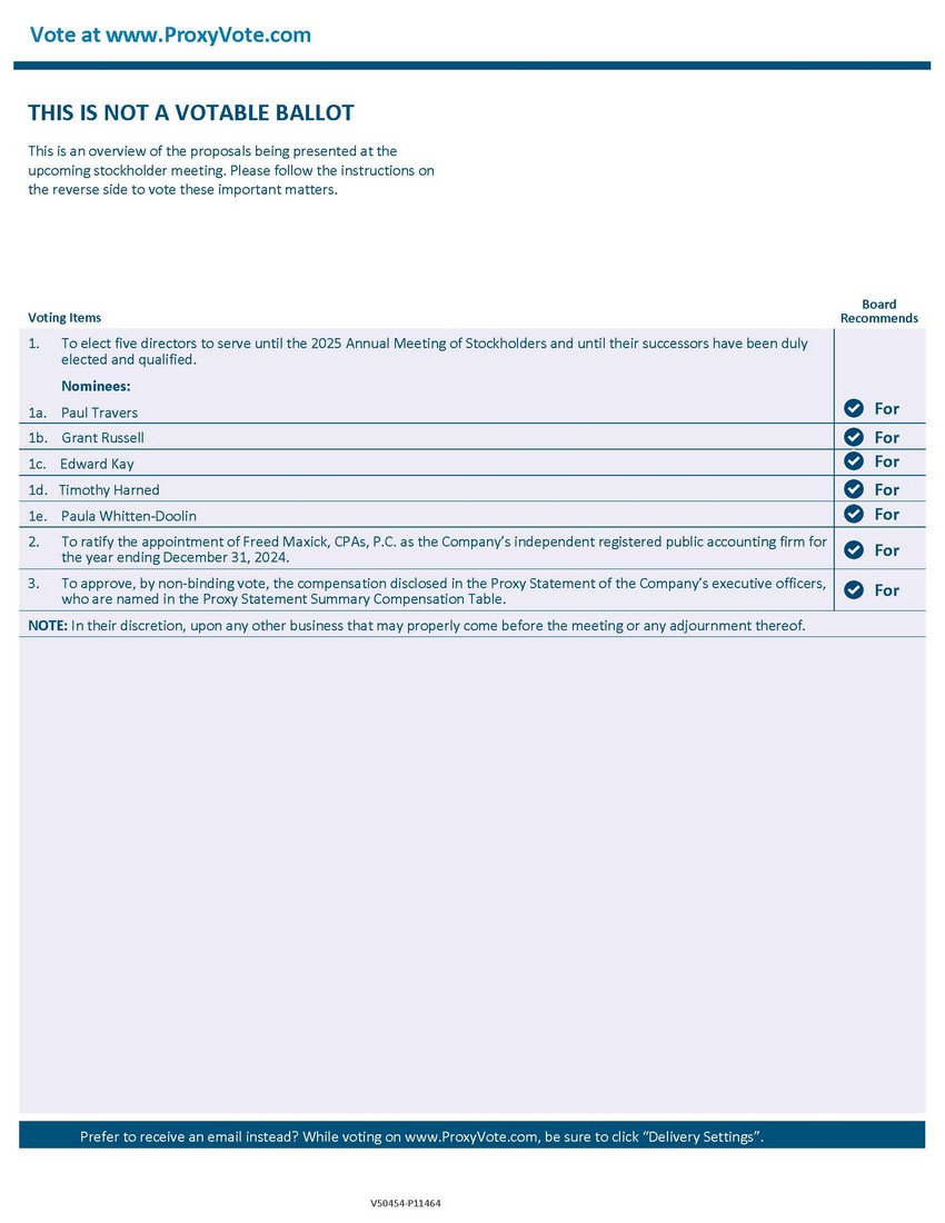 Vote at www.ProxyVote.com THIS IS NOT A VOTABLE BALLOT This is an overview of the proposals being presented at the upcoming stockholder meeting. Please follow the instructions on the reverse side to vote these important matters. Voting Items Board Recommends 1. To elect five directors to serve until the 2025 Annual Meeting of Stockholders and until their successors have been duly elected and qualified. Nominees: 1a. Paul Travers 1b. Grant Russell 1c. Edward Kay 1d. Timothy Harned 1e. Paula Whitten-Doolin 2. To ratify the appointment of Freed Maxick, CPAs, P.C. as the Company’s independent registered public accounting firm for the year ending December 31, 2024. 3. To approve, by non-binding vote, the compensation disclosed in the Proxy Statement of the Company’s executive officers, who are named in the Proxy Statement Summary Compensation Table. NOTE: In their discretion, upon any other business that may properly come before the meeting or any adjournment thereof. Prefer to receive an email instead? While voting on www.ProxyVote.com, be sure to click “Delivery Settings”. V50454-P11464